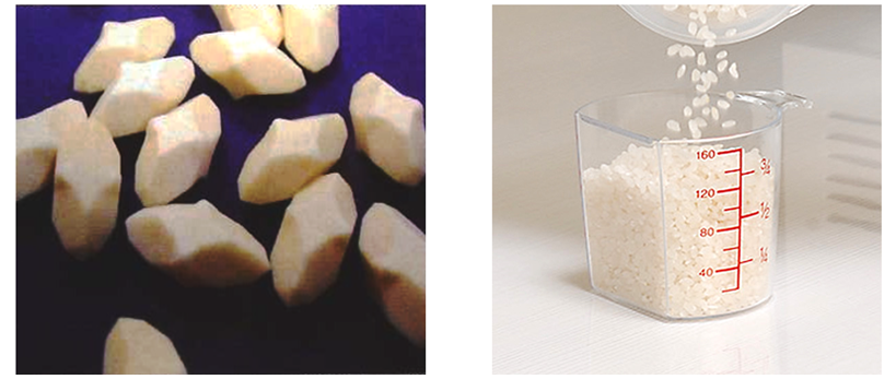 圖3.左微電腦數(shù)值分析的最佳粉末形狀模擬圖;右為亞洲人日常實(shí)用的大米,與模擬的最佳粉末外型非常相似